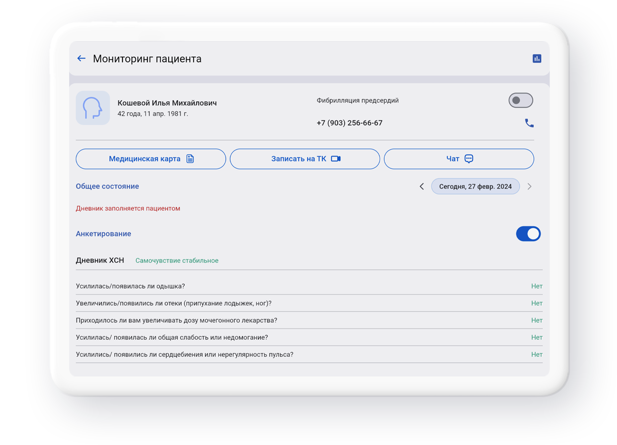 сводный мониторинг для врача, который позволяет видеть «проблемных» пациентов без изучения данных по каждому из добавленных в мониторинг